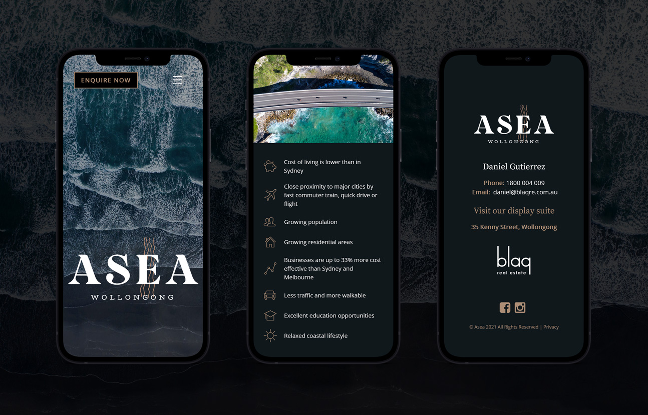 Our marketing team carefully researched Wollongong’s selling points, demographics, real estate statistics, local attractions and the convenience of the location of ASEA. We worked closely with Blaq Real Estate to establish the requirements of the project, their key target market and their visions for the brand. After extensive research, we put pen to paper (or fingers to keyboard) and started developing text for the 20 page brochure that would incorporate fine details, descriptive language and informative statistics. This detailed copy would be the basis for the written copy across the website, social media platforms and the flyers.