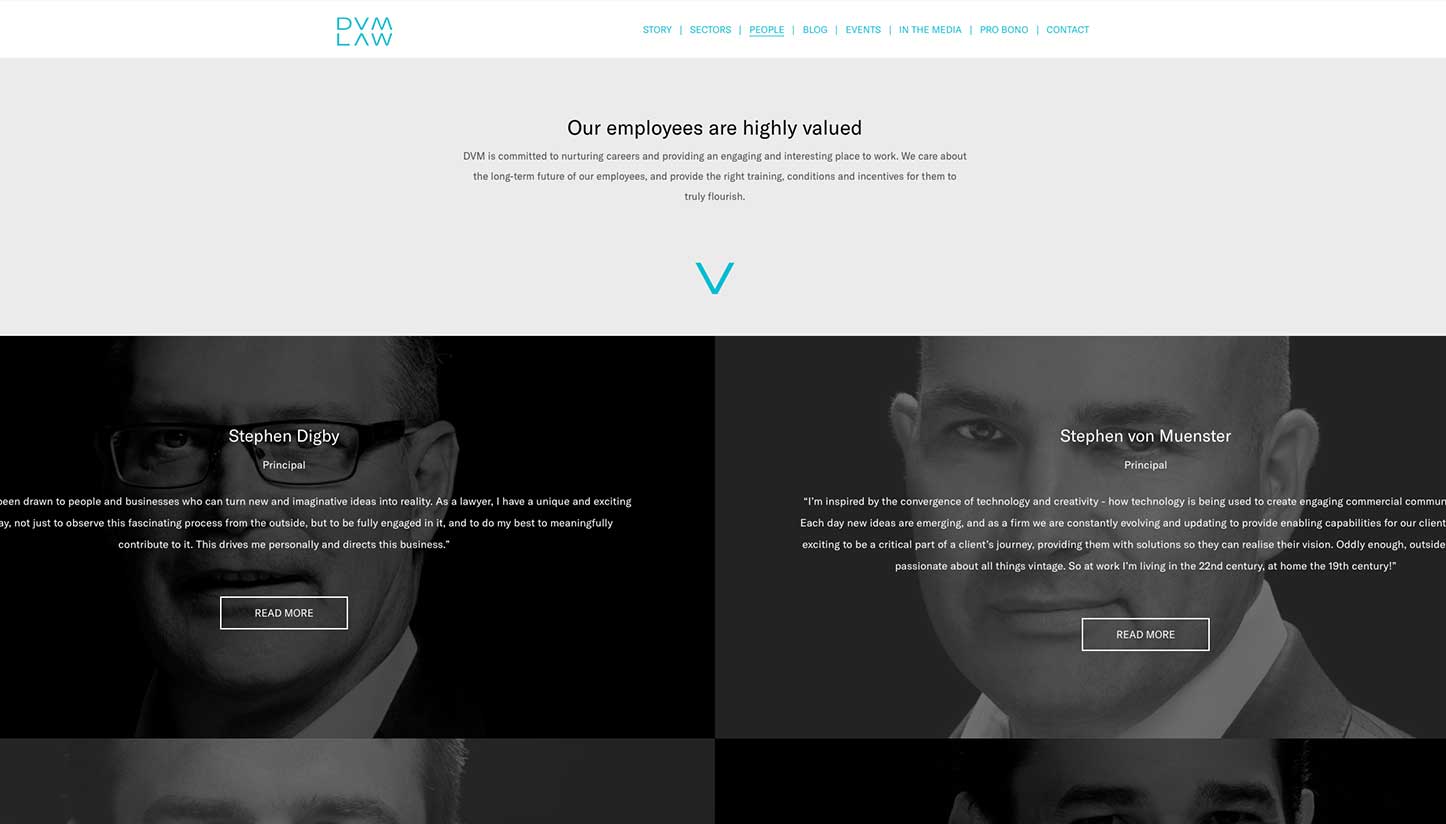 The site needed to follow the brand guide of the DVM Law brand identity, which was completed by Houston Group in Surry Hills. But it also needed to provide a fresh new look that reflected their culture of excellence and down-to-earth approach to their services.
