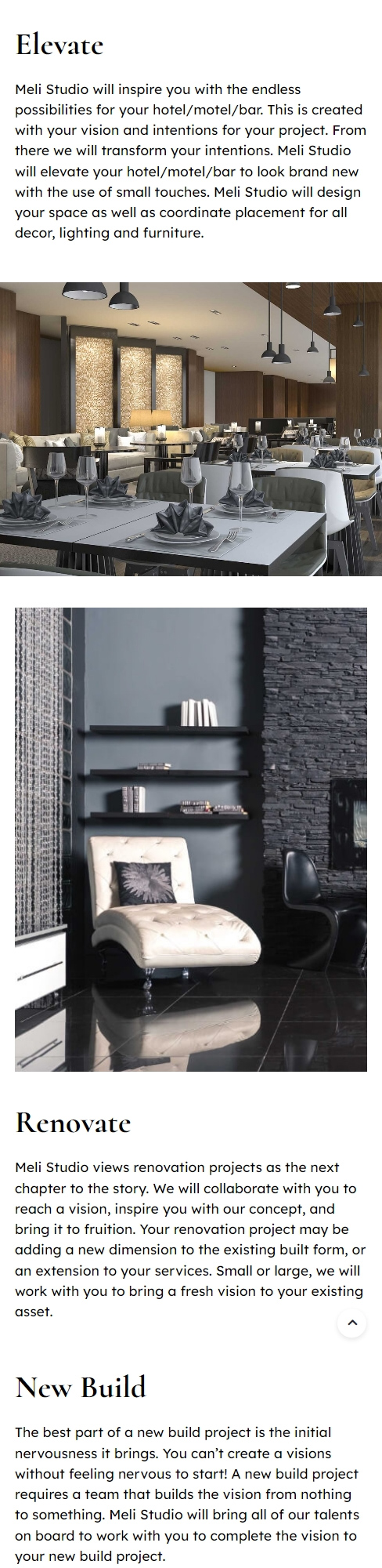 A new custom website was designed in consultation with the Meli team to achieve their desired goals of being visually appealing whilst covering a large volume of information in a clean, clear design. At the same time they wanted to maintain the integrity of their projects for commercial clients and homeowners visiting the website.